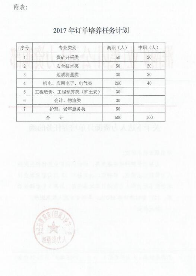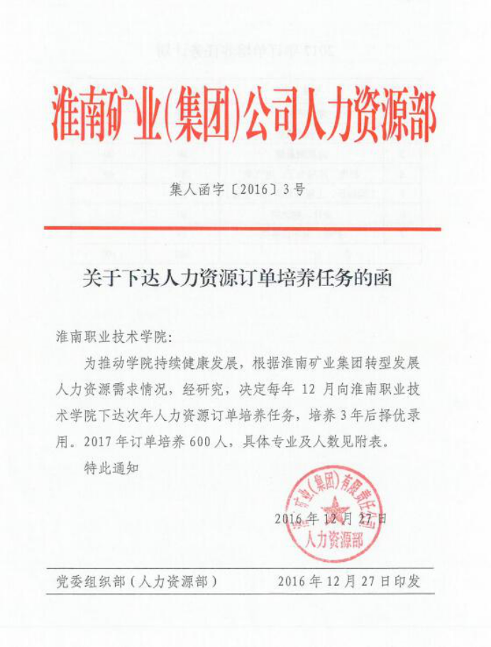 淮南矿业(集团)公司关于下达人力资源订单培养任务的函