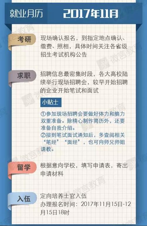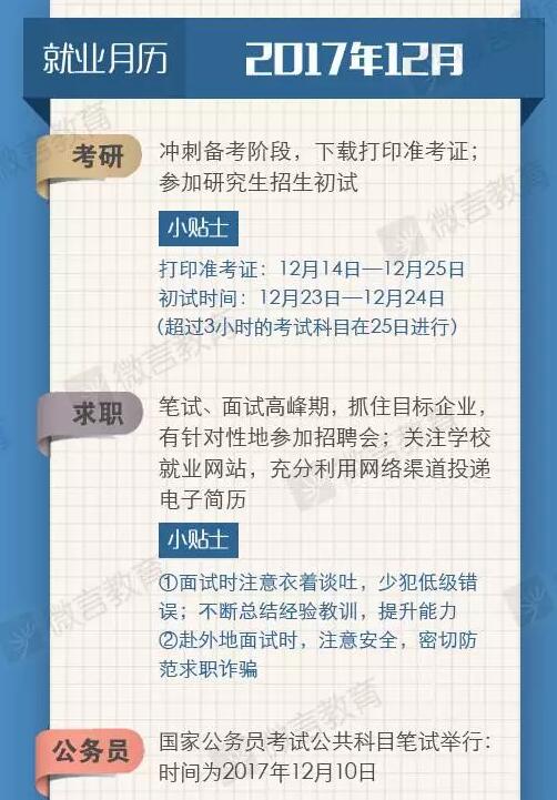 2017年余额已不足2个月,秋季招聘进入高峰期、考研笔试将至……毕业生们,每个月份应该重点关注什么?最新毕业生就业月历来了。无论你是准备考研、还是求职或者留学等等,统统用得上!